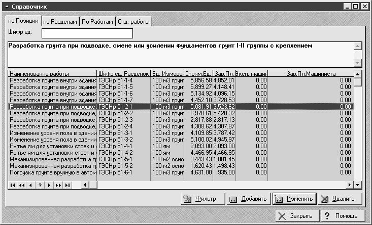 На рисунке видно, что данное окно состоит из нескольких вкладок. На вкладке По позиции (см. рис. 2.5) приводится полный перечень работ, содержащихся в справочнике. Для каждой позиции списка в соответствующих колонках отображается название работы, шифр в соответствии с ГЭСН, единица измерения работы, расценка за единицу измерения, норма заработной платы, стоимость эксплуатации машин и норма заработной платы машиниста.