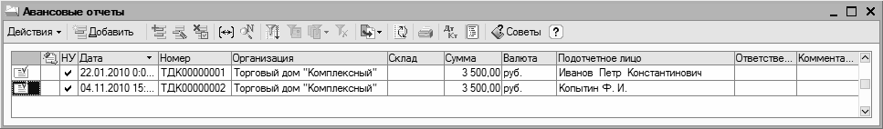 Как видно на рисунке, данное окно представляет собой стандартный интерфейс списка. Помимо уже знакомых нам столбцов, в нем имеются столбцы Склад и Подотчетное лицо. В поле Склад содержится наименование склада (места хранения), на который должны быть оприходованы ценности, приобретенные за выданные из кассы деньги. Что касается поля Подотчетное лицо, то в нем отображается ФИО подотчетника по данному авансовому отчету.