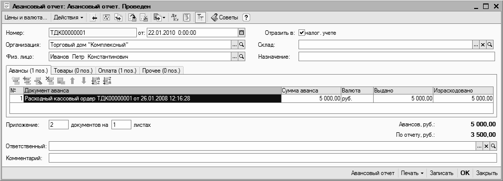 Ввод новых и редактирование сформированных ранее авансовых отчетов осуществляется в окне, изображенном на рис. 2.17.