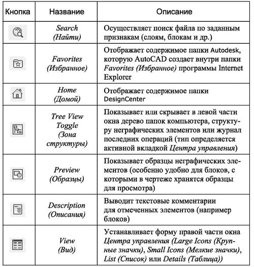 Центр управления совмещает в себе возможности обмена настраиваемыми неграфическими компонентами чертежа между различными документами и функции Проводника (аналогично одноименному приложению Windows). Последнее обстоятельство делает это окно в большинстве случаев незаменимым средством для работы.