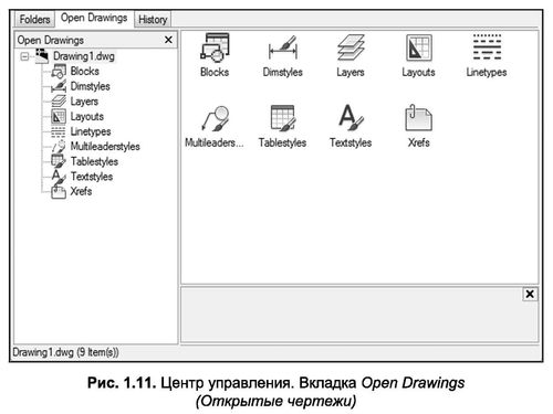 На вкладке Open Drawings (Открытые чертежи) (рис. 1.11) щелчок в левой части окна по значку [+], расположенному слева от пиктограммы чертежа, раскрывает иерархию неграфических элементов данного чертежа: Blocks (Блоки), Dimstyles (Размерные стили), Layers (Слои), Layouts (Листы), Linetypes (Типы линий), Textstyles (Текстовые стили) nXrefs (Внешние ссылки).