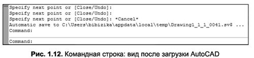 Командная строка (зона подсказки) расположена в нижней части экрана, в которой находится приглашение в форме Command (рис. 1.12). В эту область пользователем вводятся команды, параметры команд, координаты точек и другая информация. Здесь же отображаются ответы, вопросы AutoCAD и другие сообщения. Таким образом, через командную строку программа ведет диалог с пользователем на языке команд.