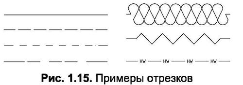 Line (Отрезок), расположенная в инструментальной группе Draw (Рисование) вкладки Ноте (Главная). Отрезки могут быть одиночными или объединяться в ломаные линии, каждый сегмент которых является самостоятельным объектом. Примеры отрезков приведены на рис. 1.15.