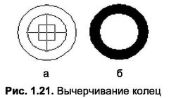 Donut (Тор), расположенная в инструментальной группе Draw (Рисование) вкладки Ноте (Главная). Команда построения тора отрабатывается таким образом, что сначала на запрос в командной строке необходимо ввести внутренний диаметр, а затем внешний. После этого тор «подвешивается» за курсор (рис. 1.21а), и вам остается только применить его как шаблон, введя координаты центра тора с клавиатуры либо указав их щелчком левой кнопки мыши в требуемой точке. Теперь вычерчивать созданный тор можно многократно – до тех пор, пока на запрос очередных координат центра не будет нажата клавиша Esc для прерывания работы команды. На рис. 1.21 показан вид перекрестия с шаблоном (а) и уже вычерченного с его использованием кольца (б).