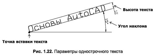 Однострочный текст характеризуется координатами точки вставки, углом поворота текста, высотой и стилем (рис. 1.22).