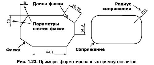Rectangle (Прямоугольник), расположенной в инструментальной группе Draw (Рисование) вкладки Ноте (Главная), достаточно ввести в командную строку или указать мышью в графической зоне координаты двух его противолежащих вершин. Кроме того, команда Recta ng имеет несколько уточняющих параметров, позволяющих создать прямоугольник со срезанными фасками или скругленными углами (рис. 1.23).