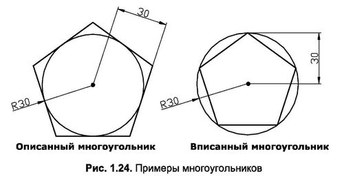 Под многоугольниками в AutoCAD подразумеваются замкнутые, геометрически правильные фигуры с равными внутренними углами и со сторонами одинаковой длины (рис. 1.24). Допустимое максимальное количество сторон для многоугольника равно 1024, а минимальное – 3. Очевидно, что в случае увеличения числа сторон многоугольник будет стремиться к окружности.