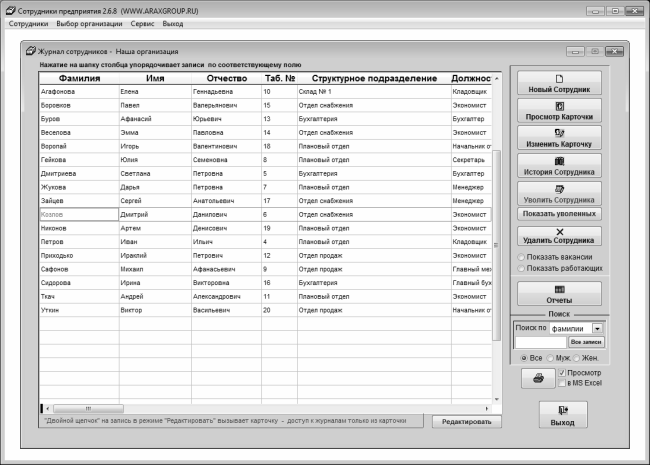 С помощью пункта Сотрудники осуществляется переход в режим работы со списком сотрудников предприятия. Как мы уже отмечали ранее, этот режим открывается по умолчанию при запуске программы, но если вы находитесь в другом режиме (например, в настройках программы или в режиме работы со списком организаций), то для быстрого возврата к списку сотрудников используйте пункт Сотрудники.