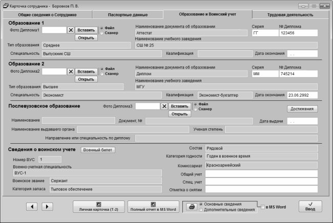 Рис. 1.14. Ввод сведений об образовании и воинском учете