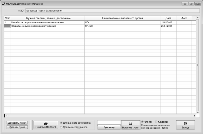 В центральной части окна формируется список научных достижений сотрудника. Для каждой позиции списка в соответствующих колонках показывается ее порядковый номер, краткое наименование (ученая степень, звание, открытие и т. д.), наименование органа (учреждения, организации и т. п.), выдавшего документ о научном достижении, и дата выдачи этого документа. При необходимости можно поместить также и фото документа – для этого нужно нажать кнопку Вставить фото, которая расположена в нижней части интерфейса, и в открывшемся окне по обычным правилам Windows указать путь к требуемому файлу, после чего нажать кнопку ОК. Чтобы впоследствии просмотреть это фото, нужно в колонке Фото дважды щелкнуть мышью.