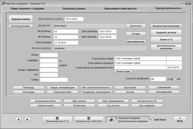 На вкладке Трудовая деятельность, содержимое которой показано на рис. 1.16, вводится самая разнообразная информация о трудовой деятельности работника предприятия.