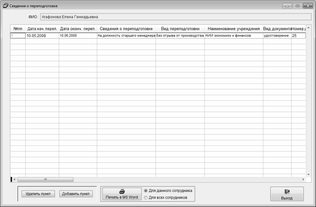 Вывод документа на печать осуществляется нажатием кнопки Печать в MS Word – при этом содержимое списка будет выведено в отдельном окне Word, откуда его можно распечатать по обычным правилам Windows. Если расположенный правее переключатель установлен в положение Для данного сотрудника (это значение установлено по умолчанию), то будет сформирован отчет о переподготовке (переподготовках) по сотруднику, указанному в верхней части окна в поле ФИО. Если же данный переключатель установлен в положение Для всех сотрудников, то будет сформирован отчет о переподготовке (переподготовках) всех сотрудников предприятия.