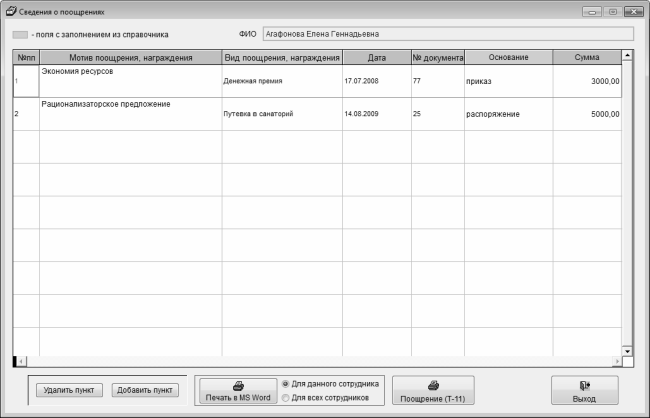Вывод документа в окно Word для последующей распечатки осуществляется нажатием кнопки Печать в MS Word. Если при этом расположенный правее переключатель установлен в положение Для данного сотрудника (значение по умолчанию), то печатная форма документа будет включать в себя информацию только по сотруднику, указанному в верхней части окна в поле ФИО; при установленном значении Для всех сотрудников будет сформирован отчет о поощрениях всех сотрудников предприятия.