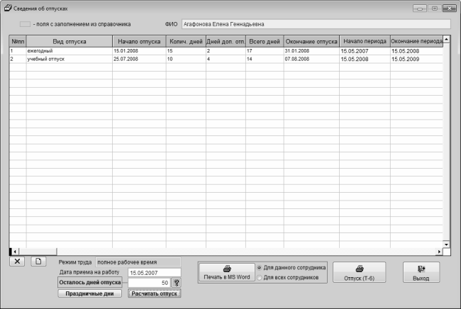 В данном окне ведется список всех отпусков сотрудника, который указан в верхней части окна в поле ФИО (значение данного поля с клавиатуры не редактируется).