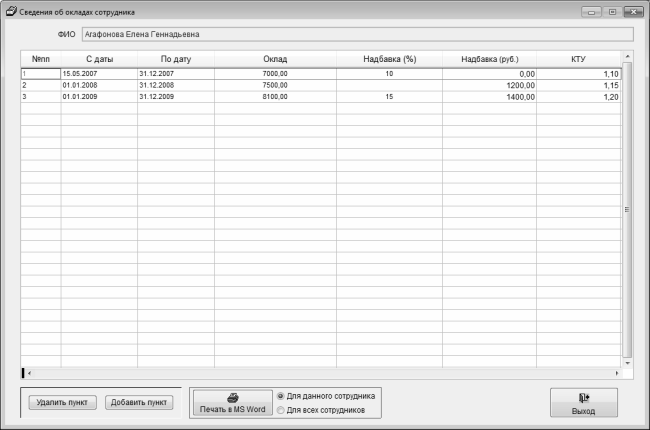 Чтобы вывести в окно Word для последующей распечатки отчет по сотруднику, указанному в верхней части окна в поле ФИО, нужно установить соответствующий переключатель в положение Для данного сотрудника (это положение используется по умолчанию), и нажать кнопку Печать в MS Word. Аналогичным образом формируется отчет о должностных окладах всех сотрудников предприятия – с той разницей, что переключатель должен быть установлен в положение Для всех сотрудников.