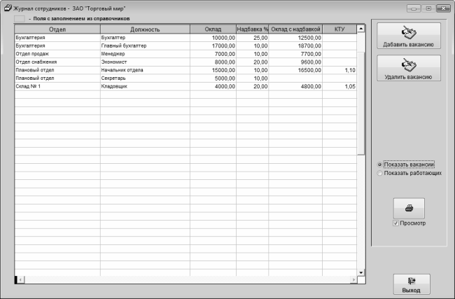 В программе «Сотрудники предприятия» реализован механизм ведения списка имеющихся предприятий. Чтобы перейти в режим работы с этим списком, нужно в окне журнала работников установить переключатель, который находится ниже кнопки Удалить сотрудника, в положение Показать вакансии. Пример списка вакансий предприятия показан на рис. 1.33.