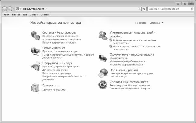 Содержимое панели управления в зависимости от функционального назначения сгруппировано по категориям, для открытия которых предназначены соответствующие ссылки (см. рис. 3.25). Отметим, что с помощью ссылок вы можете не только открыть категорию, но и перейти непосредственно к одному из ее элементов. Кратко рассмотрим основные категории панели управления и входящие в их состав элементы.