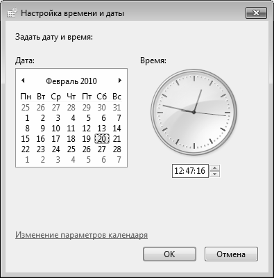 Для перехода в режим настройки даты и времени нужно в панели управления (Пуск ? Панель управления) выбрать категорию Часы, язык и регион и щелкнуть в ней мышью на ссылке Установка даты и времени. Можно поступить проще – для этого достаточно щелкнуть мышью на значке даты и времени в панели задач, после чего в появившемся окне щелкнуть на ссылке Изменение настроек даты и времени (рис. 3.28).