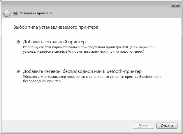 В данном окне нужно выбрать тип устанавливаемого принтера. Для большинства рядовых пользователей в данном окне нужно щелчком мыши выбрать значение Добавить локальный принтер – это означает, что к конкретному компьютеру подключен конкретный принтер (как это обычно и бывает, например, в домашних условиях). После выбора этого значения будет выполнен переход к следующему этапу установки (рис. 3.38).