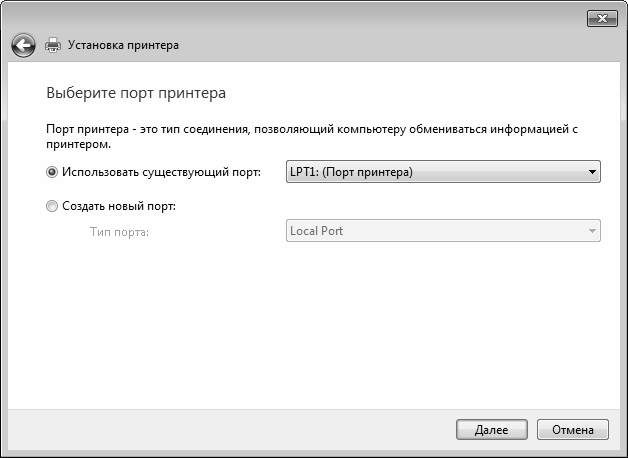 На данном этапе нужно указать порт принтера. В данном случае порт – это канал (тип соединения) для обмена информацией между компьютером и принтером, попросту говоря – это разъем для подключения принтера. Вы можете использовать существующий или создать новый порт – для этого нужно установить переключатель в соответствующее положение. В большинстве случаев на данном этапе можно оставить параметры, предложенные по умолчанию – когда переключатель установлен в положение Использовать существующий порт, а из раскрывающегося списка выбрано значение LPT1: (Порт принтера).