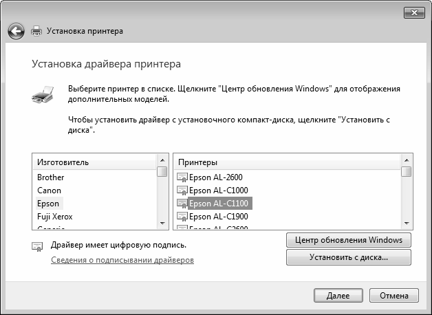 По умолчанию в системе Windows 7 имеется большой набор драйверов для самых разных устройств, в том числе и для принтеров. Поэтому для его установки вам достаточно в левой части окна (см. рис. 3.39) выбрать изготовителя принтера, а в правой – конкретную модель принтера. Тем не менее, в системе реализована возможность и самостоятельной установки драйвера, находящегося на внешнем носителе – для этого нужно вставить диск в привод и нажать кнопку Установить с диска.