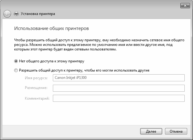 После нажатия кнопки Далее программа выполнит установку принтера. Затем система предложит определить, будет этот компьютер доступен для других пользователей или нет (рис. 3.41).