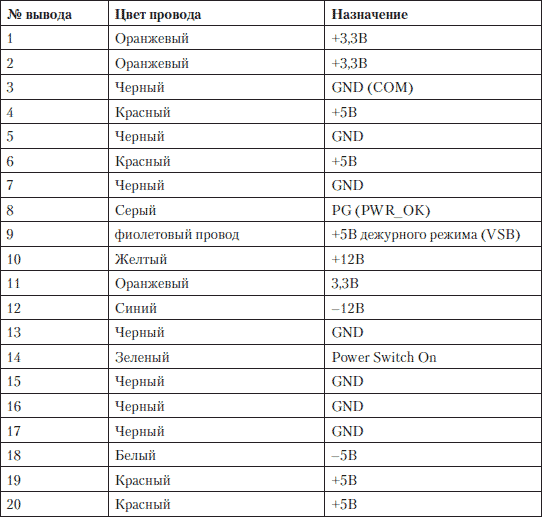 Основной разъем БП содержит 20 контактов, расположенных в 2 ряда. Описание их приведено в табл. 4.2, указаны стандартно используемые цвета проводников.