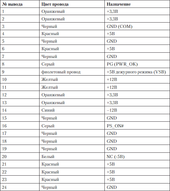 Таблица 4.5. 24-контактный разъем питания БП АТХ 12V 2. 0