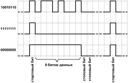 Для приемника и передатчика, связанных между собой тремя проводами («земля» и два сигнальных провода: «туда» и «обратно»), приходится задавать скорость передачи и приема, которая должна быть одинакова для устройств на обеих концах линии. Эти скорости стандартизированы и выбираются из ряда от 110 до 115200 битов в секунду. Проблема состоит в том, что приемник и передатчик – это физически совершенно разные системы, и скорости эти для них не могут быть строго одинаковыми (из-за разброса параметров тактовых генераторов), и даже если их каким-то образом синхронизировать в начале, то они в любом случае быстро «разъедутся». Поэтому в RS-232 придумали передачу каждого байта сопровождать начальным (стартовым) битом, который служит для синхронизации. После него идут от пяти до восьми информационных битов (девять – если используется проверка на четность), а затем стоповые биты, которых может быть один, два и более, – предполагается, что за время прохождения всей этой посылки приемник и передатчик по частоте «разойтись» не успеют.