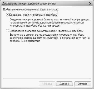 В данном окне с помощью переключателя нужно указать, каким образом должна быть создана информационная база. Если вы только начинаете работать с программой 1С, и информационных баз до настоящего момента не было создано, нужно установить переключатель в положение Создание новой информационной базы, чтобы сформировать новую пустую базу для последующей работы. Второй вариант предназначен для подключения созданной ранее информационной базы.