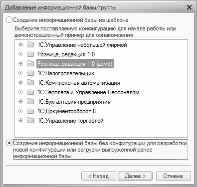 При выборе второго варианта (нижнее положение переключателя) будет создана информационная база без конфигурации. К ней можно будет впоследствии подключить требуемую конфигурацию из соответствующего внешнего файла (это делается в режиме Конфигуратор).