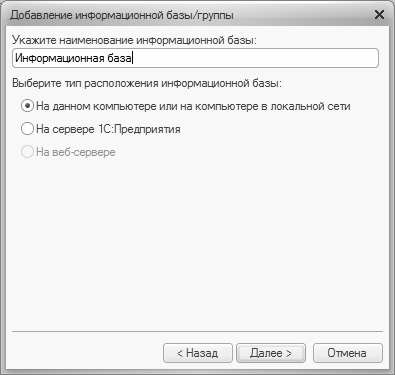 Рис. 1.4. Ввод имени и типа расположения информационной базы