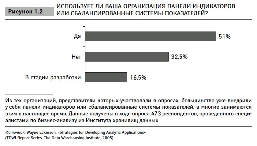 Вследствие такой конвергенции с 2000 г. интерес к панелям индикаторов резко повысился. Исследование, проведенное в 2004 г. Институтом хранилищ данных (TDWI), показало, что в большинстве опрошенных организаций (51 %) панели индикаторов или сбалансированные системы показателей уже используются и что еще 17 % в настоящее время разворачивают у себя подобные системы. То же исследование показало, что почти треть организаций, уже имеющих на вооружении панели индикаторов или сбалансированные системы показателей, используют их в качестве основных приложений для генерирования отчетов и анализа данных (см. рис. 1.2).