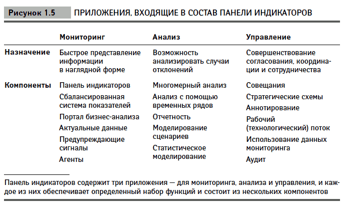 Первое, что бросается в глаза при переходе от контекста к структуре панели индикаторов, – то, что она содержит три приложения, сплетенные в единый комплекс прозрачным для пользователя образом. Каждое из этих приложений обеспечивает определенный набор функциональных возможностей, реализуемых разными способами. С технической точки зрения такие приложения – это не обязательно разные программы (хотя иногда бывает и так), это некие комплексы взаимосвязанных функций, созданных на базе информационной инфраструктуры и предназначенных для выполнения требований пользователя в отношении мониторинга, анализа и управления эффективностью (см. рис. 1.5).