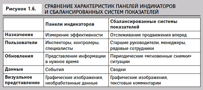 Панели индикаторов и сбалансированные системы показателей – это механизмы визуализации в системе управления эффективностью, позволяющие мгновенно представлять критически важную информацию в наглядной форме. Разница между ними заключается прежде всего в том, что панели индикаторов используются в основном для отслеживания операционных (оперативных) процессов, в то время как сбалансированные системы показателей – для отслеживания продвижения к тактическим и стратегическим целям (см. рис. 1.6).