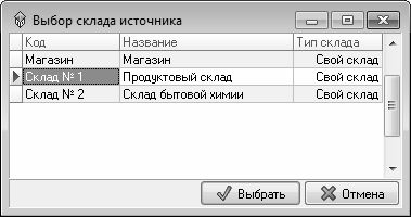 Для выбора склада-источника нужно выделить его в списке курсором и нажать кнопку Выбрать. Сразу после этого откроется аналогичное окно, в котором точно таким же образом нужно выбрать склад или иное подразделение предприятия, на которое будут оприходованы товары по данному документу (склад назначения).