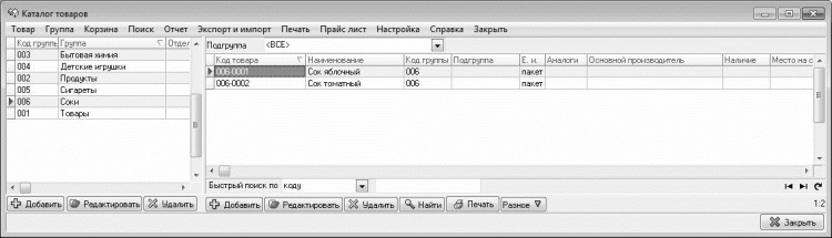 В первую очередь необходимо добавить товары «Сок яблочный» и «Сок томатный» в справочник товаров. Откроем справочник товаров (Справочники?Товары) и создадим в нем товарную группу Соки, в которую добавим позиции Сок яблочный и Сок томатный так, как это показано на рис. 1.28.