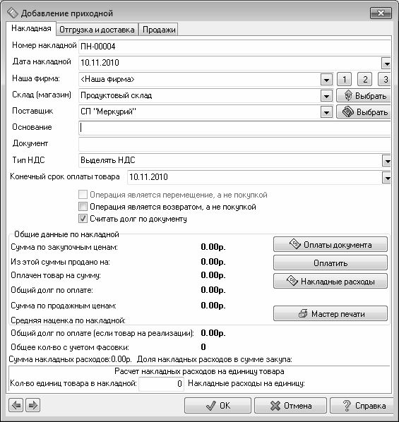 Теперь формируем приходную накладную на все количество поступивших товаров. Вначале введем основные данные по документу так, как показано на рис. 1.29.