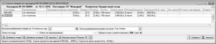 В данном случае, как и при заполнении спецификации расходной накладной, вам необходимо только выбрать требуемые позиции в справочнике товаров и указать количество каждой из них. Все остальные параметры спецификации программа рассчитает автоматически. При необходимости можно отредактировать фактическую цену.