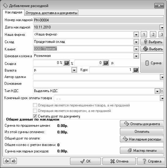 Теперь приступим к формированию расходной накладной на отпуск товаров на сторону. Для этого войдем в режим работы с расходными накладными (Документы?Расходные документы) и введем основные данные по документу так, как это показано на рис. 1.31.