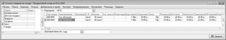 Теперь нам осталось лишь узнать, какое количество товара осталось на складе Продуктовый склад после оприходования и последующего отпуска на сторону и внутреннего перемещения части товара. Для этого нужно выйти из режима работы с расходными документами и выполнить команду главного меню Остатки?Товары на складе (складах), после чего в открывшемся окне выбрать Продуктовый склад. Результат выполненных действий показан на рис. 1.34.