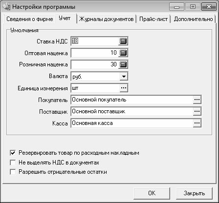 На вкладке Учет осуществляется настройка основных учетных параметров; также здесь определяются значения полей, которые будут использоваться по умолчанию в тех либо иных режимах работы программы (в частности, при создании новых документов). Содержимое данной вкладки показано на рис. 2.3.