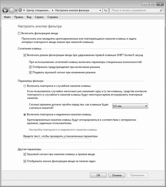 Также вы можете выполнить настройку режима фильтрации ввода, который позволяет игнорировать случайные повторные нажатия клавиш. Для этого щелкните на ссылке Настройка фильтрации ввода (см. рис. 1.3) – в результате на экране отобразится окно, изображенное на рис. 1.5.