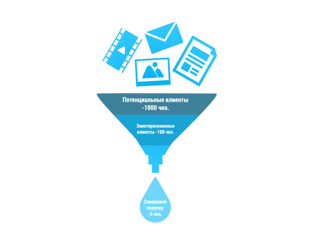 Верхушка воронки – это все те, кто пришел на бесплатное мероприятие. Скажем так, статистические единицы. Чуть ниже – это те, кто купил какую-нибудь мелочевку или подписался на рассылку, или стал захаживать на блог автора… Ну и внизу – сами знаете кто и зачем.