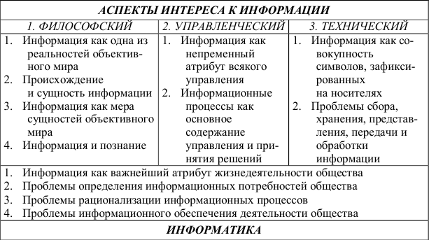 В. А. Герасименко в названной выше работе с прагматических позиций определяет информатику как научное (или научно-техническое) направление, основные задачи которого заключаются в изучении информационных потребностей общества и разработке путей, средств и методов наиболее рационального их удовлетворения. На рис. 2 показаны некоторые аспекты взгляда на информацию, составляющие предмет интереса дисциплины «Информатика»[45].