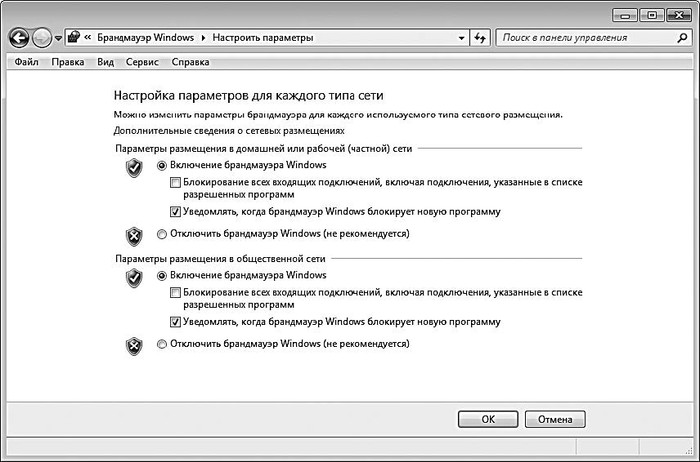 Операционная система Windows имеет встроенное средство защиты от внешних угроз, которое входит в комплект поставки, – брандмауэр Windows. По умолчанию он включен, и без серьезных на то оснований менять его настройки не рекомендуется. Если все же необходимо настроить параметры брандмауэра, то откройте Панель управления, и в категории Система и безопасность выберите раздел Брандмауэр Windows, после чего в левой части открывшегося окна щелкните на ссылке Включение и отключение брандмауэра Windows. В результате выполненных действий на экране откроется окно, изображенное на рис. 1.5.