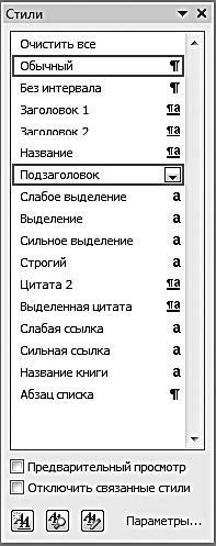 Заголовком у нас будет являться словосочетание Форматирование текста, которое следует в самом начале текста. Его необходимо выделить, а затем на вкладке Главная в панели Стили нажать кнопку со стрелочкой, расположенную справа от названия панели, либо комбинацию клавиш Alt+Ctrl+Shift+S. В результате в правой части интерфейса откроется окно со списком имеющихся в программе стилей (рис. 2.9).