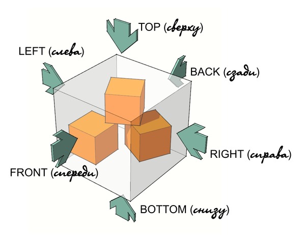 Представим, что наша сцена (т.е. все ее объекты) находится внутри воображаемого куба с прозрачными стенками – т.е. сцена ограничена 6-ю смежными, взаимно перпендикулярными плоскими поверхностями. При этом линии пересечения (границы) этих поверхностей (ребра куба) направлены строго вдоль соответствующих осей сцены X,Y,Z, а потому сами поверхности ориентированы строго параллельно воображаемым плоскостям, образуемым каждой парой осей (их еще называют «планами осей»).