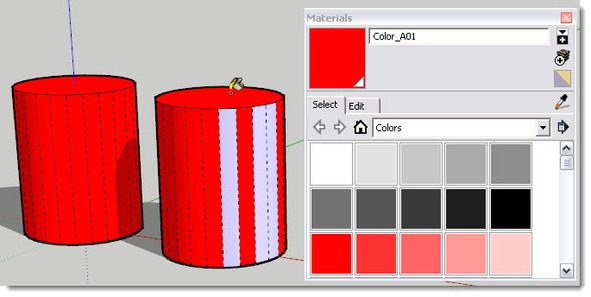 Типичная схема работы с материалами следующая: после выбора инструмента курсор Paint Bucket изменяется на символ «ведерка» и одновременно открывается диалоговое окно Materials (Материалы), которое содержит стандартные коллекции включенных в программу материалов и их набор, используемый в текущем проекте. Далее, выбрав нужный материал, кликаем «ковшиком» на объект – «окрашиваем» его, «заливая» всю выбранную поверхность в ее границахребрах. Этот же принцип работает в окраске сглаженных криволинейных поверхностей (Surfaces), которые, как знаем, на самом деле не более чем набор плоских (Faces) поверхностей – они воспринимаются и «заливаются» окраской как единое целое. В то же время, если включить режим показа скрытой геометрии (View> Hidden Geometry), начинают «работать» ребра каждой из Face, и такая «общая» окраска становится невозможной.