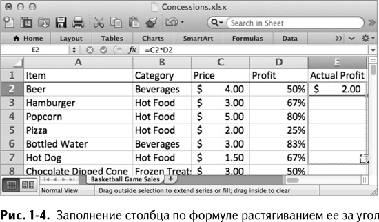Для строки с пивом результат будет равным $2. Не нужно переписывать формулу для каждой строки. Excel позволяет переносить формулы из ячейки перетаскиванием за правый нижний угол куда вам угодно. Значения в столбцах С и D будут меняться в зависимости от того, куда скопирована формула. Если, как в случае с данными о продажах, столбец слева полностью заполнен, дважды кликните на правом нижнем углу ячейки с формулой, и Excel заполнит значениями весь столбец, как это показано на рис. 1–4. Попробуйте этот двойной клик сами, потому что я буду использовать его во всей книге. Освоив его сейчас, вы избавите себя от огромных неудобств в будущем.